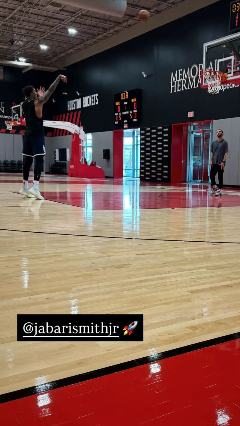 虎扑09月02日讯 火箭球员贾巴里-史密斯更新ins,晒出了自己在火箭训练馆的投篮训练照。