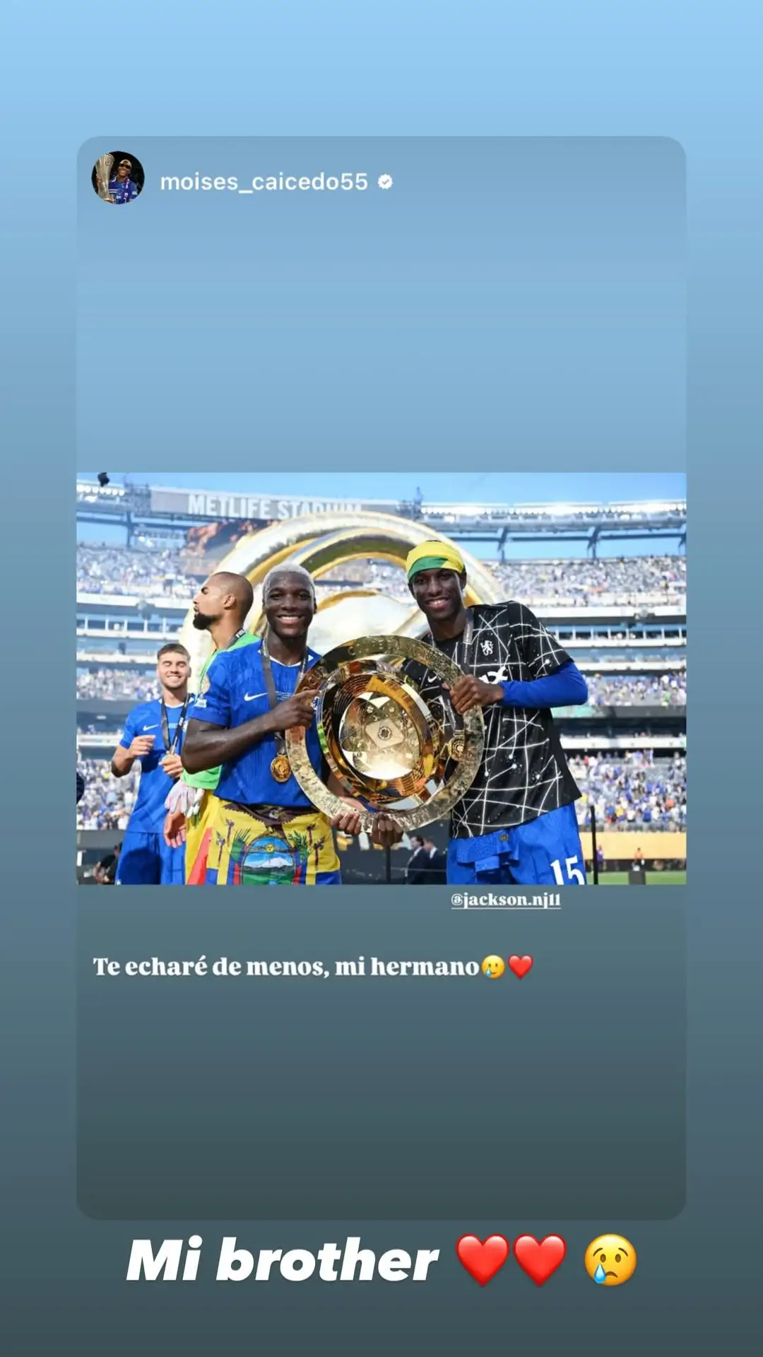 来源:Instagram虎扑09月03日讯 杰克逊加盟拜仁后,切尔西中场凯塞多发布社媒:我会想念你的,我的兄弟。