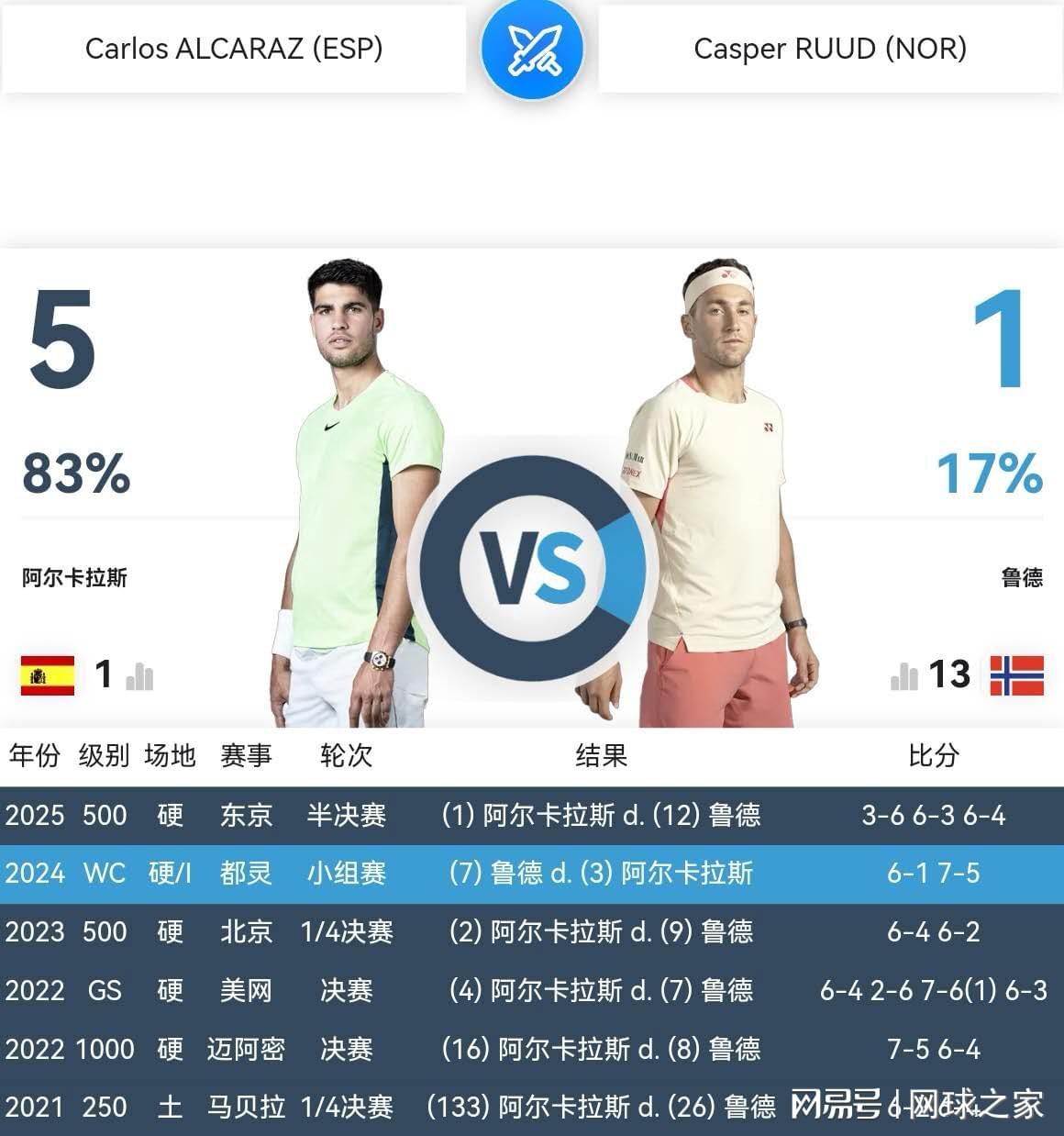 去年ATP500东京站半决赛,两人职业生涯第六次交锋,也是最近一次交锋,带伤作战的阿尔卡拉斯3:6先输一盘之后,以6:3 6:4的比分连扳两盘,逆转战胜了鲁德。最后决赛,阿尔卡拉斯两盘完胜美国奶爸弗里茨,职业生涯首次参加该站赛事就夺取冠军。